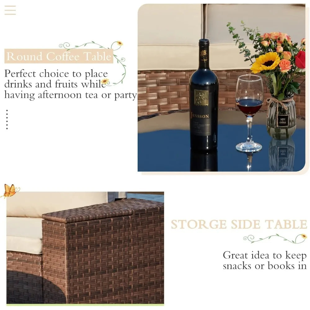 7 Piece Patio Set Half Moon Curved Wicker Storage Armrests