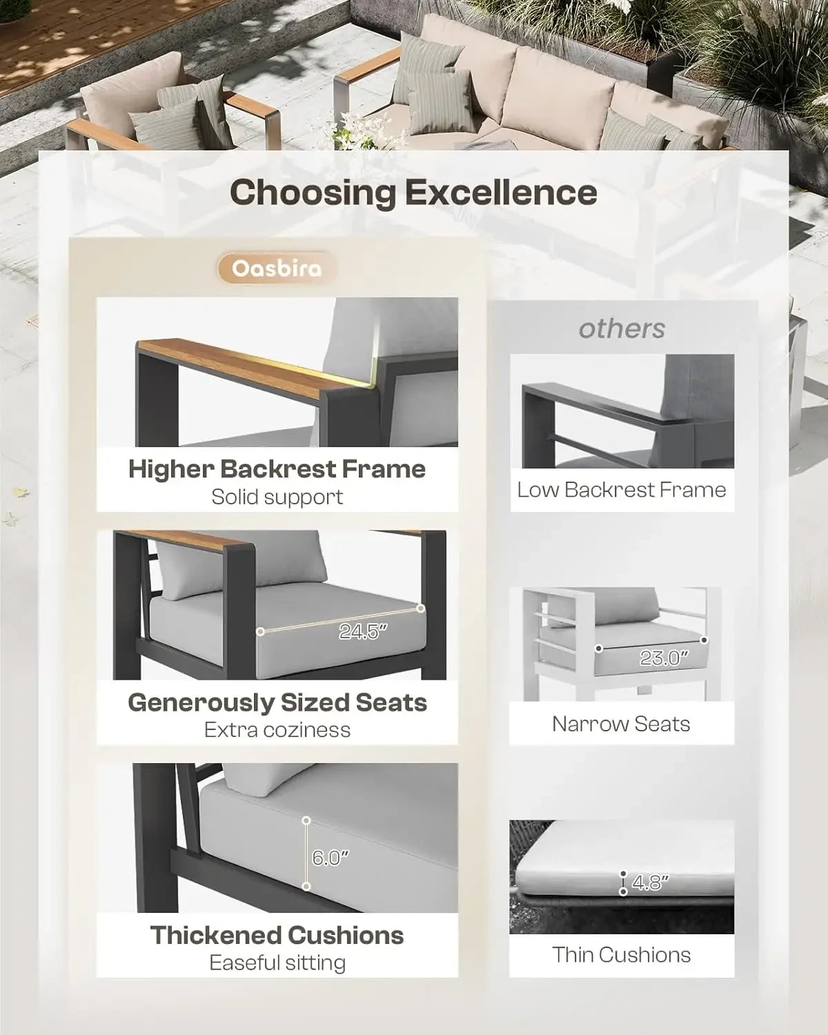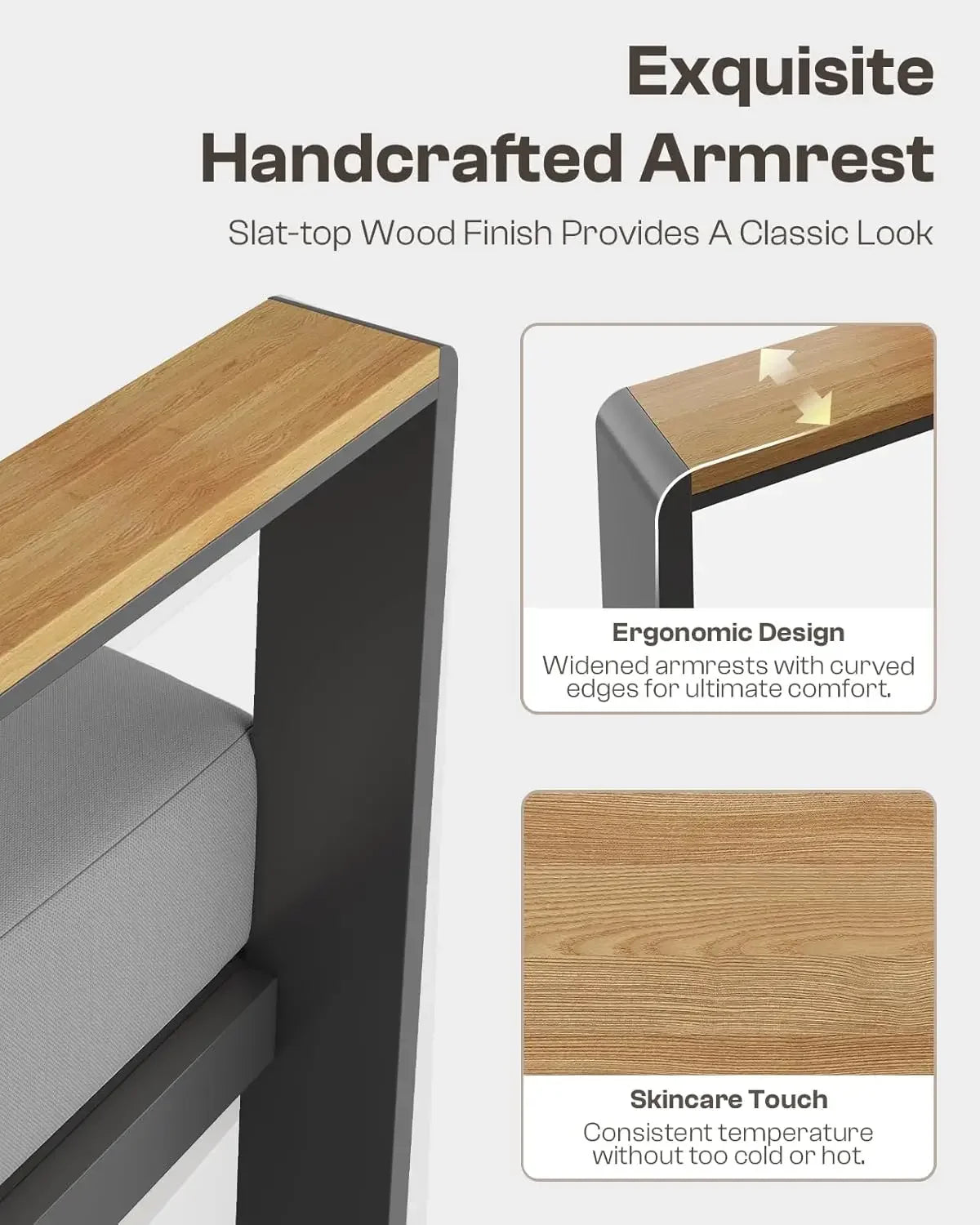 Built to endure the elements, the lightweight yet sturdy aluminum frame resists rust and retains a sleek gray finish that pairs beautifully with any outdoor decor. The integrated coffee table adds convenient surface space for drinks, snacks, or decor, making this set perfect for entertaining on a porch, balcony, or deck.