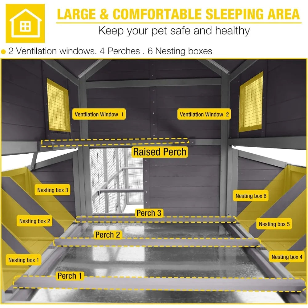 - 6 Raised Perches: Features 4 raised perches inside the sleeping house and 2 additional perches in the chicken run area, providing ample space for chickens to roost and rest