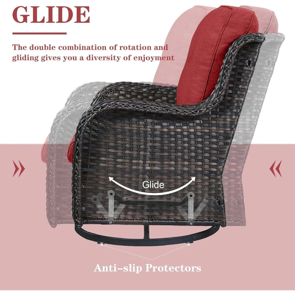 - Patio Furniture Set Introduction: The 5-piece patio furniture set includes 2 swivel glider chairs, 2 ottoman and a sofa, ottoman can not only be used to relax your legs, but also can be used as a small table or small stool. The swivel chairs can hold up to 350 pounds.