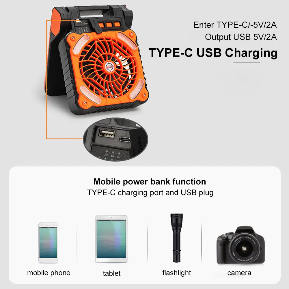Solar Outdoor Camping Fan With LED Light 5200mAh IPX4