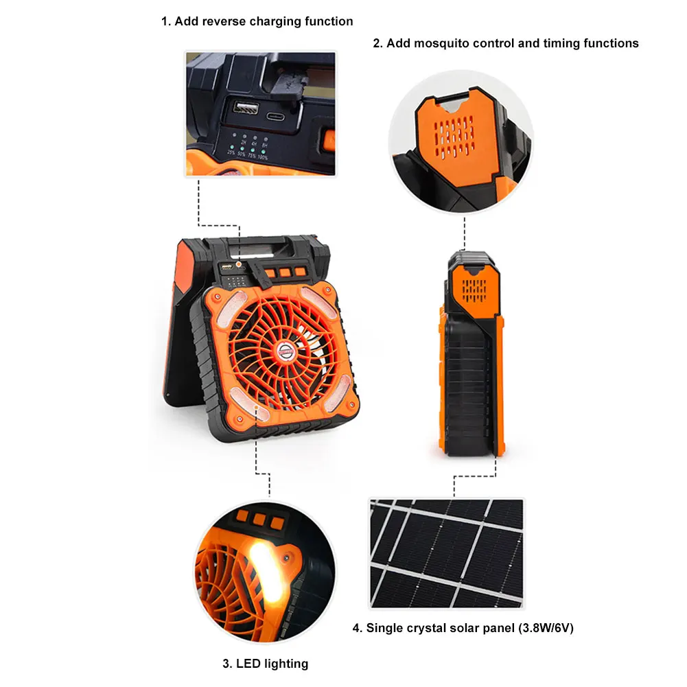 Solar Outdoor Camping Fan with LED Light USB Rechargeable Solar Portable Electric Fan IPX4 Waterproof Solar Powered Camping Fan for Hiking Fishing Picnic Features: 1.Solar-Powered Versatility: This solar outdoor camping fan is equipped with a solar panel, enabling simultaneous charging and usage. With high photoelectric conversion efficiency, it can charge even in low-light weather. 2.Mosquito Repellent & Timer Function: Capable of heating mosquito repellent tablets (tablets not included), this solar portable electric fan ensures you enjoy mosquito-free outdoor activities. 3.Long-Lasting Battery Life: Powered by a 5200mAh battery with low loss rate, the solar outdoor tent fan operates for approximately 6 to 20 hours. 4.Easy Charging Options: Utilize the TYPE-C cord to connect the charging port or use the USB port to charge your phone with this solar cordless tent fan. 5.Triple-Level Mosquito Repellent: Enhance mosquito-repelling effects with three levels of yellow light and heat-up mosquito repellent tablets (not included) using this solar powered camping fan. Specification: Origin: Mainland China Material: PC+ABS Color: Black, Green, Orange, Yellow Size: 23cm79.06in*17cm/6.69in*7.5cm/2.95in Weight: About 1000g (with packaging box) Fan mode: Four wind speeds, 1st gear silent wind-2nd gear natural wind-3rd gear-cool wind-4th gear strong wind Lighting mode: LED always on Battery capacity: 5200mAH Battery life: fan can be used for about 6~20 hours; LED battery life is about 36 hours Charging: 4-6H Input: Type-C Waterproof level: IPX4 Timing: 2H/4H/8H Motor: Brushless motor 9V Characteristics: Four wind speeds, timing function, LED lighting, solar charging, 5200mah large capacity, can be used as a power bank Note: 1*Solar Camping Fan 1*Charging Cable ![]() |